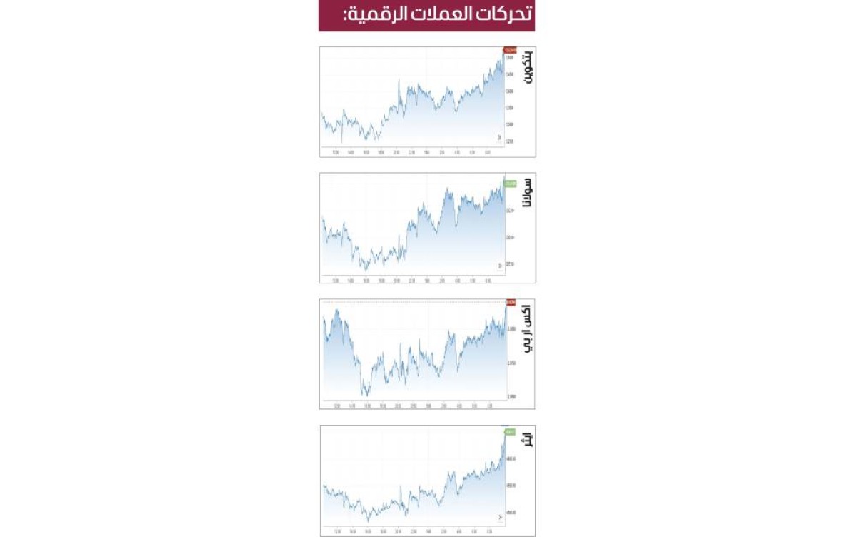 ارتفعت العملات الرقمية المشفرة خلال تعاملات أمس، مع تزايد المخاوف المالية في بعض من أكبر اقتصادات العالم، ما يعزز جاذبية الأصول البديلة مثل المعادن الثمينة والعملات المشفرة.