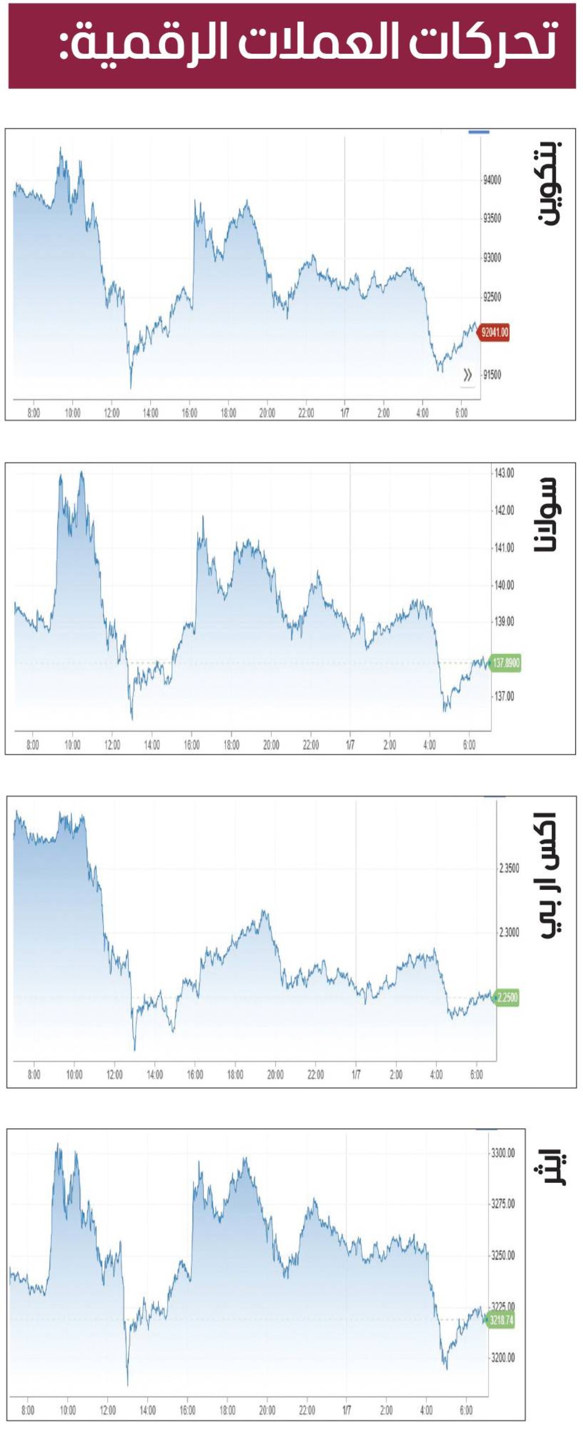 وهبطت إيثيريوم، ثاني أكبر العملات المشفرة من حيث القيمة السوقية، بنسبة 0.70 % إلى 3220.59 دولاراً، وخسرت الريبل نحو 1.9 % لتتداول عند 2.2394 دولار.