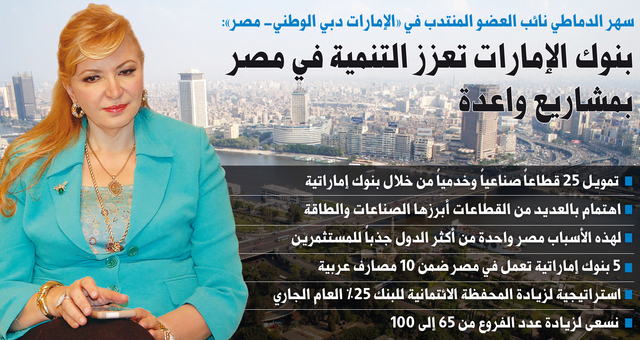 كشفت سهر الدماطي نائب العضو المنتدب وعضو مجلس الإدارة والرئيسة التنفيذية للمخاطر في بنك «الإمارات دبي الوطني- مصر» عن أن الدولة المصرية تبذل جهوداً كبيرة في إصدار التشريعات والقوانين الاقتصادية لتدعيم ثقة أصحاب رؤوس الأموال في الداخل والخارج، موضحة أن البنوك الإماراتية تتصدر العديد من التمويلات الخاصة بالمشروعات القومية في مصر، حيث تساهم بدور قوي في تمويل المشاريع التنموية الواعدة في القطاعات المختلفة.