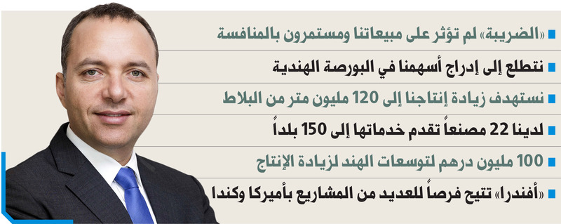 نعمل حالياً على زيادة قدرة إنتاج بلاط إضافية في الهند ونتوقع أن تتجاوز سعتنا الإجمالية للبلاط 120 مليون متر مربع بحلول نهاية عام 2018، حيث تقوم الشركة حالياً بإنفاق 100 مليون درهم على توسعاتها التي تجري في موربي وغوجارات في الهند لزيادة الطاقة الإنتاجية.