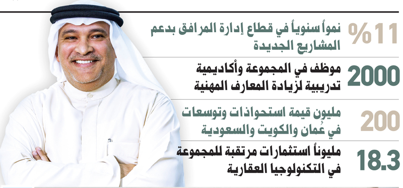وأشار إلى أن المجموعة تعمل على التوسع في سلطنة عُمان والكويت والمملكة العربية السعودية، وقد خصصت 200 مليون درهم لخطط الدمج والاستحواذ فضلاً عن خطط لاستثمار 18 مليون درهم في التكنولوجيا العقارية في المجموعة، التي يعمل فيها 2000 موظف، فضلاً عن إلى إطلاق أكاديمية تدريبية لزيادة حرفيتهم. ويرى الشرف أن السنوات الخمس المقبلة قد تشهد تمكين المستأجرين من تلبية جميع احتياجاتهم العقارية من خلال تطبيق إلكتروني بدءاً من تجديد عقود الإيجار إلى حجز ملعب للتنس وطلب خدمات التنظيف، وإلى التفاصيل: