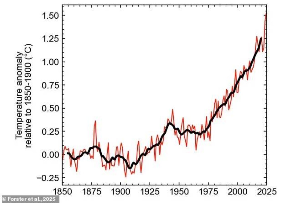 ووجد التقرير أن عام 2024 شهد درجات حرارة مرتفعة، حيث وصلت إلى 1.52 درجة مئوية أعلى من المعيار قبل الثورة الصناعية. بشكل عام، 1.36 درجة مئوية من هذا الاحترار مباشرة يرجع إلى النشاط البشري، بينما 0.16 درجة مئوية المتبقية تأتي من التقلبات الطبيعية وفق ميل أون لاين.