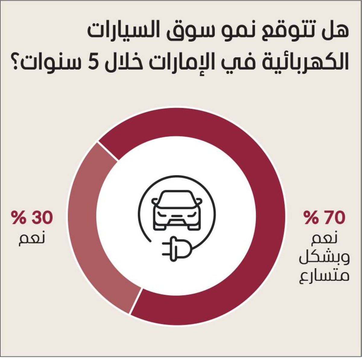 وحول ارتفاع حالات رفض طلبات تمويل السيارات من قبل المصارف، قال 30% إن هناك حالات رفض بالفعل، فيما أجاب 60% بلا، وامتنع 10% عن التعليق. وحول توقعاتهم بنمو سوق السيارات الكهربائية في الإمارات خلال 5 سنوات، أكد 70% منهم أنه سينمو بشكل متسارع، فيما قال 30% إنه سينمو فعلاً ولكن ببطء.