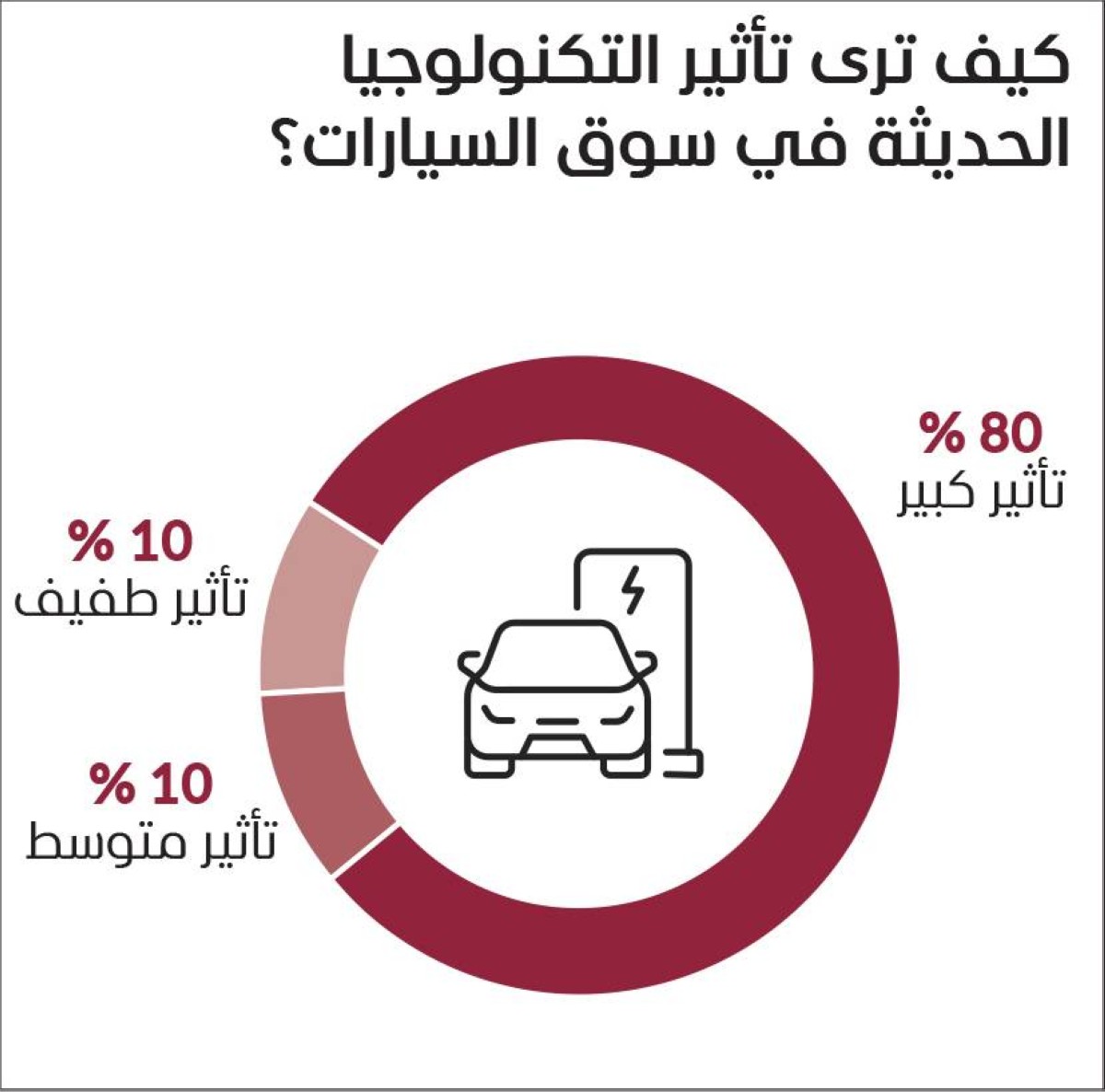 وحول تأثير التكنولوجيا الحديثة في سوق السيارات بشكل عام، رأى 80% أنه تأثير كبير، فيما وصفه 10% بالمتوسط، و10% بالطفيف.
