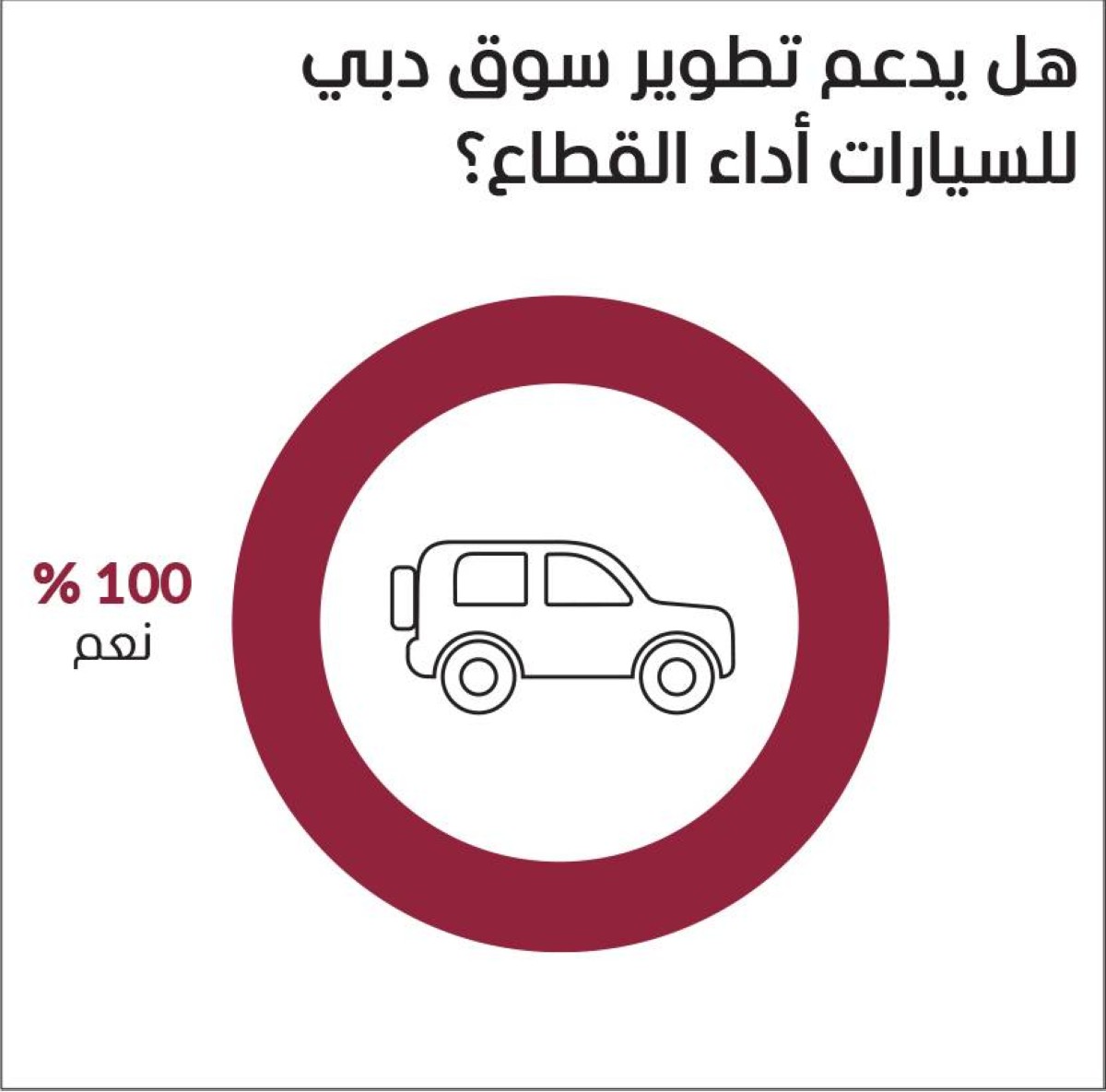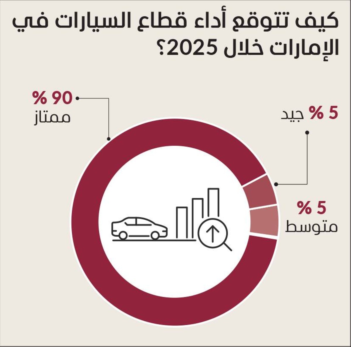 وفي هذا الإطار، أجرت «البيان» استطلاعاً للرأي شمل 8 من مديري كبرى شركات السيارات في الإمارات، الذين توقعوا أن يكون أداء قطاع السيارات في الدولة خلال العام الجاري ممتازاً ونسبتهم 90%، فيما قال 5% إنه سيكون جيداً و5% قالوا إنه سيكون متوسطاً.