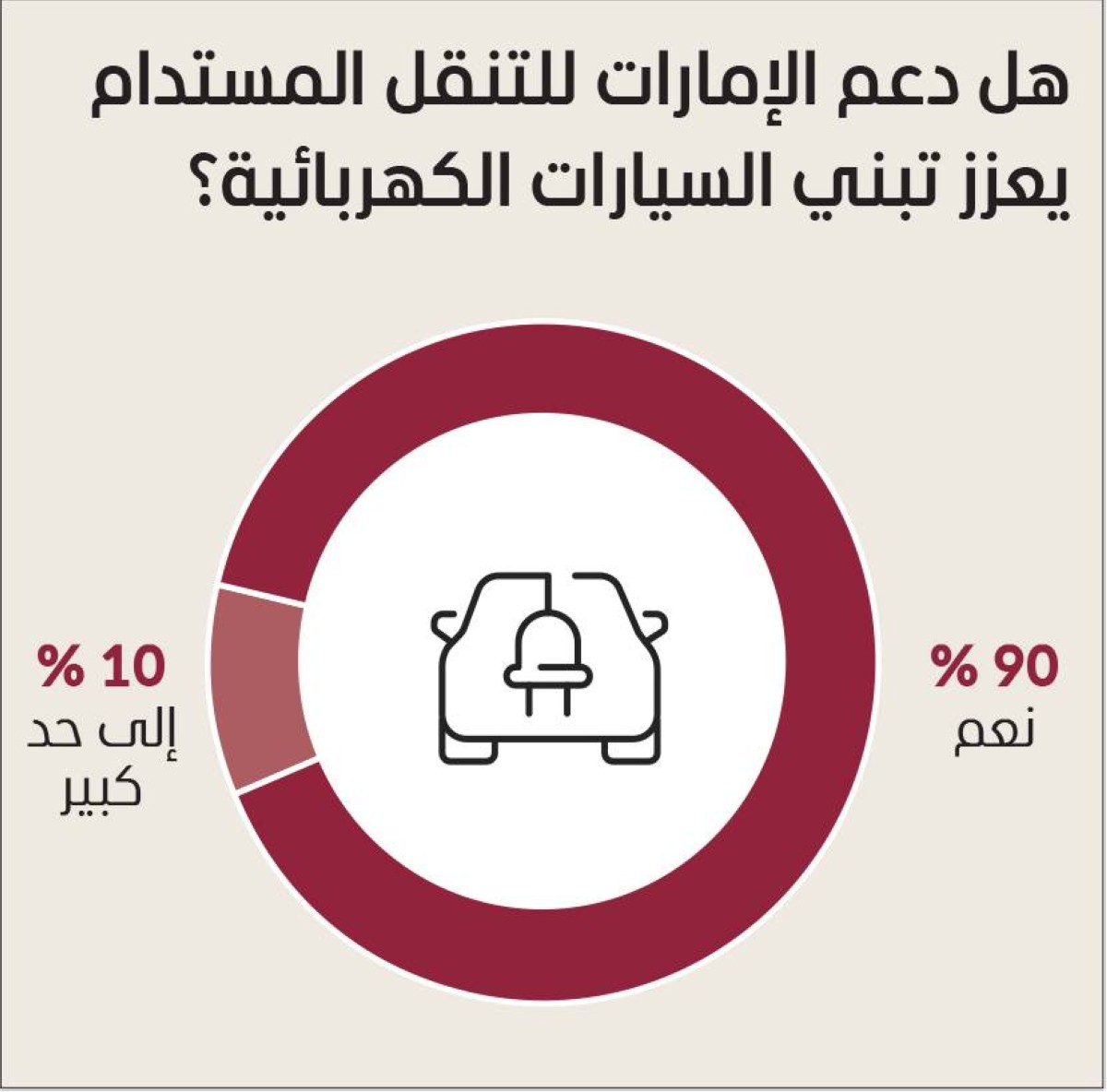 وفيما يتعلق بالإمارات وهل دعمها للتنقل المستدام يعزز من تبني السيارات الكهربائية، أجاب 90% بنعم، فيما قال 10% إلى حد كبير.