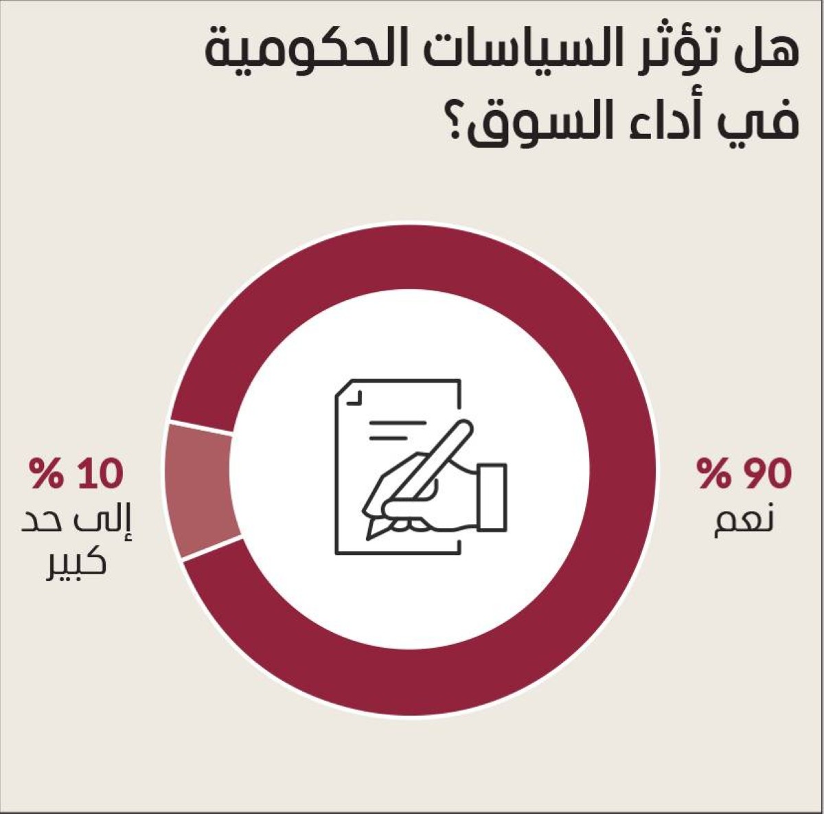 وحول السياسات الحكومية وتأثيرها على أداء السوق، قال 90% إنها تؤثر، فيما قال 10% إلى حد كبير.