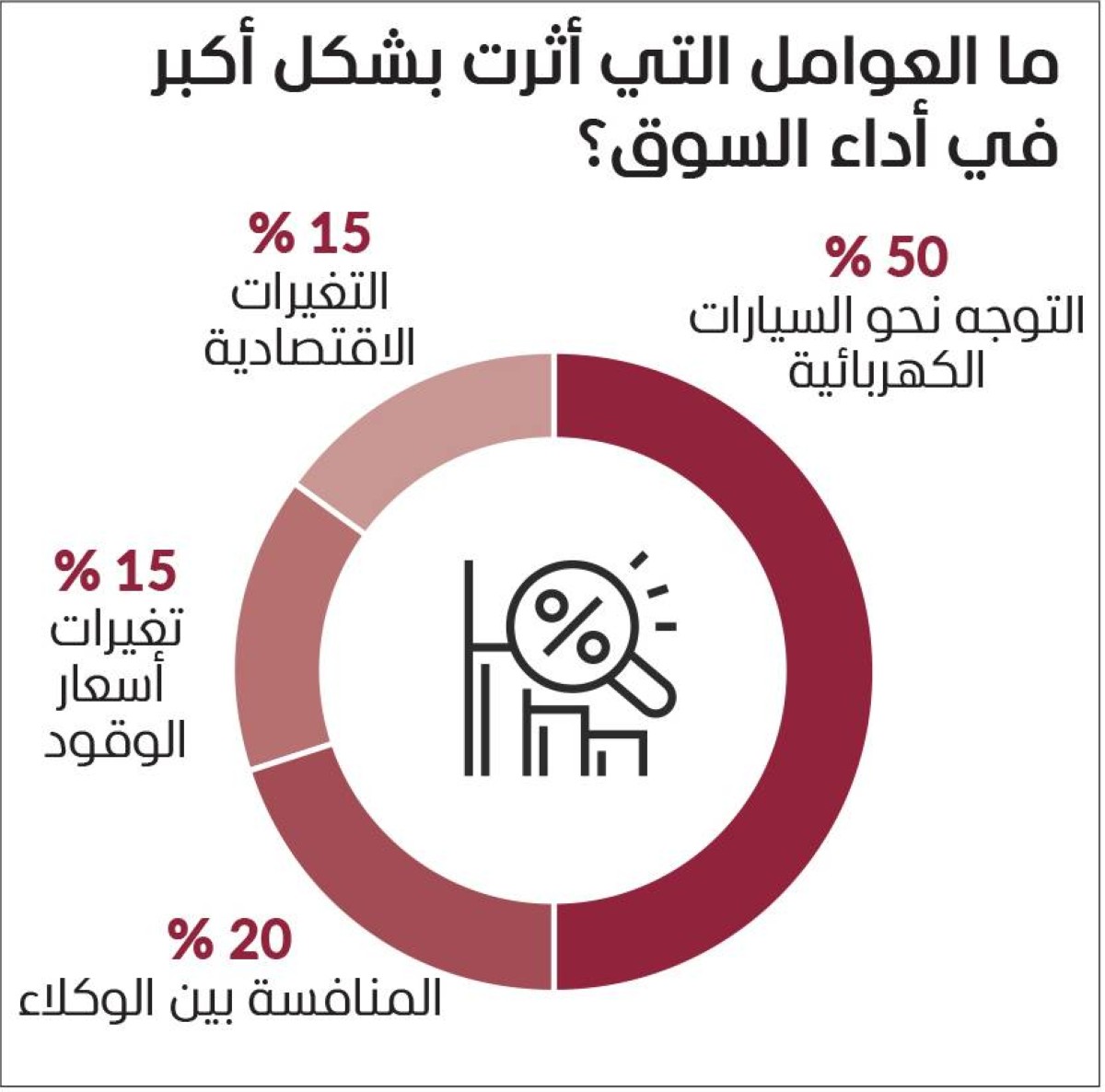 وفيما يخص العوامل التي أثرت بشكل أكبر في أداء السوق، رأى 50% أنها تتركز في التوجه نحو السيارات الكهربائية، فيما أرجع 20% منهم إلى المنافسة بين الوكلاء، و15% إلى التغيرات الاقتصادية، و15% إلى التغيرات في أسعار الوقود.