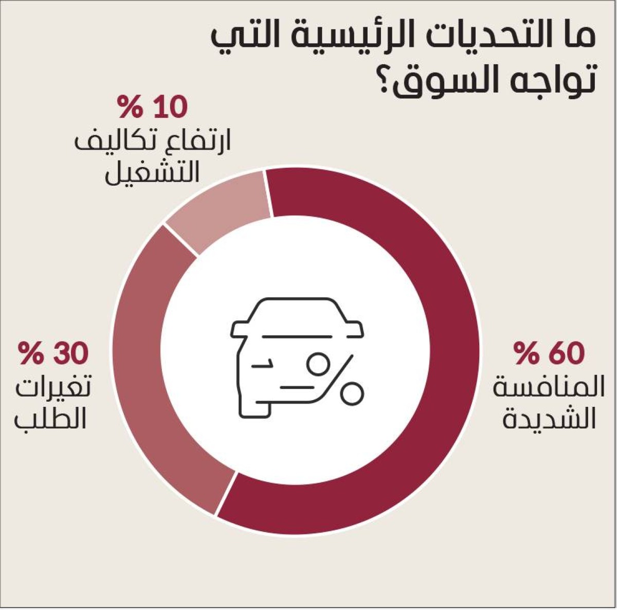 وفيما يخص التحديات الرئيسية التي تواجه السوق، رأى 60% إنها تتلخص في المنافسة الشديدة، فيما أرجعها 30% إلى تغيرات الطلب، و10% إلى ارتفاع تكاليف التشغيل.