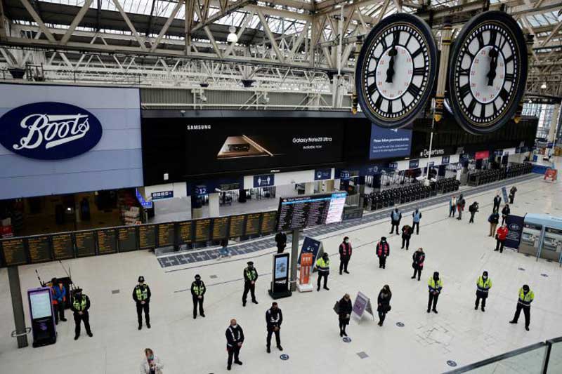 واحتشد منذ الفجر بعض مما يزيد عن 40 ألفا من عمال السكك الحديدية، الذين يعتزمون الإضراب أيام الثلاثاء والخميس والسبت، عند حواجز أقاموها مما أصاب شبكة السكك الحديدية بالشلل وترك المحطات الرئيسية خالية من الرواد. كما أن مترو أنفاق لندن مغلق في أغلبه بسبب إضراب منفصل.