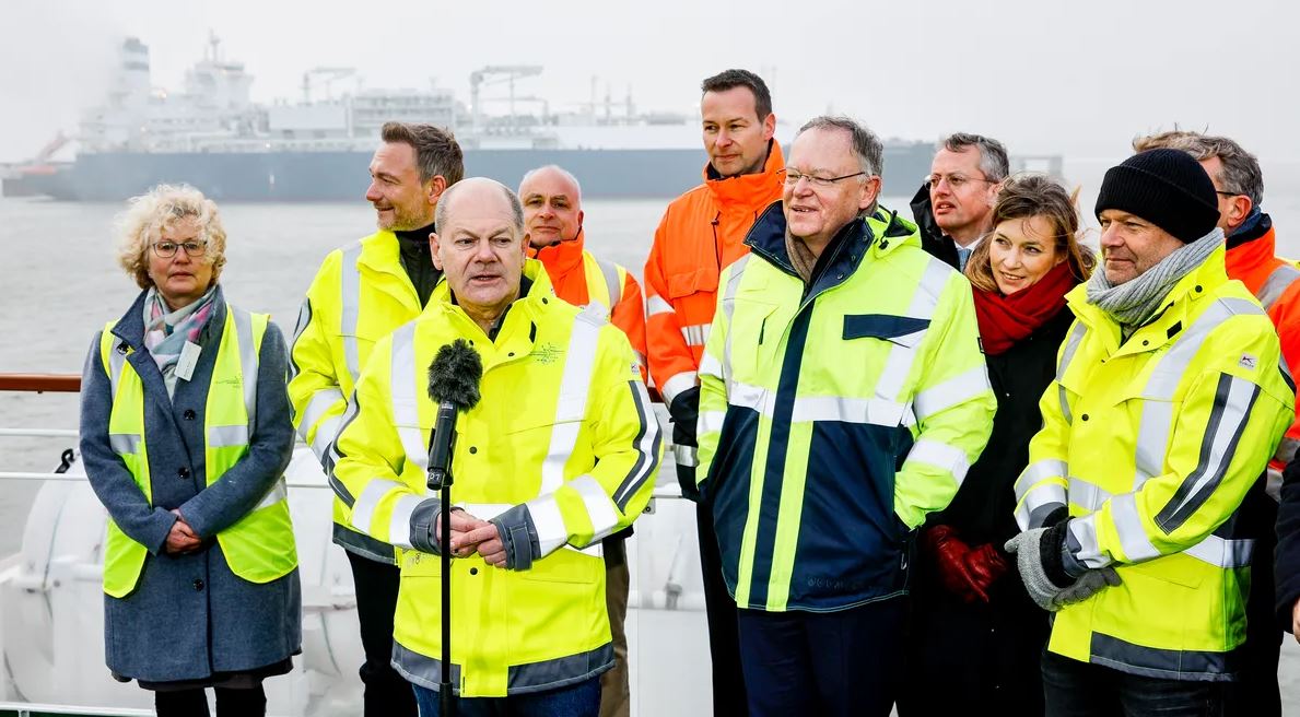 وقال المستشار أولاف شولتس، مرتديًا سترة صفراء، على ظهر مركب، على بعد أمتار قليلة من محطة فيلهلمسهافن على شاطئ بحر الشمال "إنه يوم خير لبلدنا وإشارة للعالم كله إلى أن الاقتصاد الألماني قادر على أن يبقى قويا".