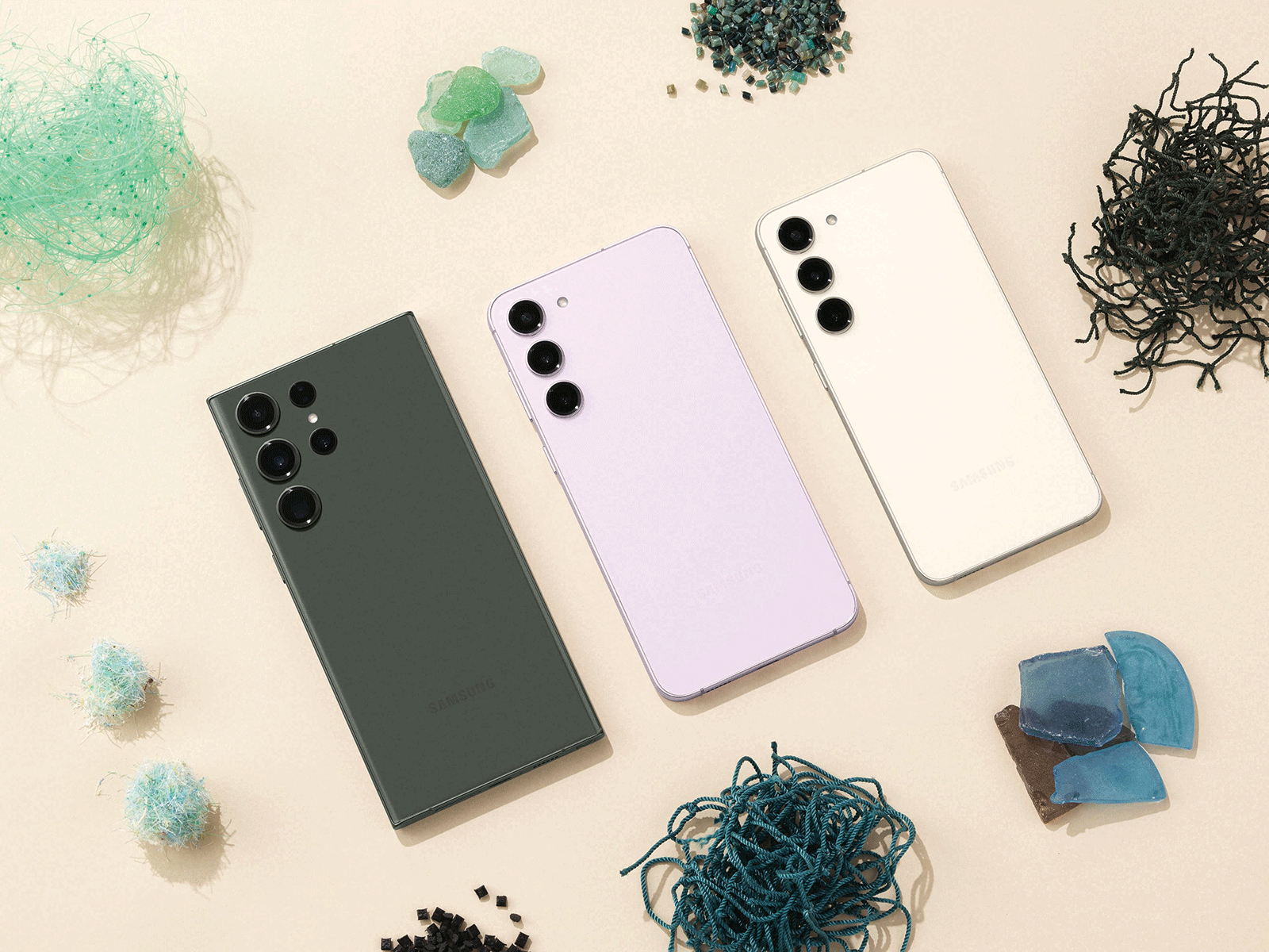 وتسهم سلسلة «جالاكسي 23»، التي تأتي بأربعة ألوان غير لامعة وتكون مستوحاة من الطبيعة وهي الأسود الفانتوم ولون الكريما والأخضر واللافندر، في الارتقاء بمستوى التكنولوجيا المتميزة التي يمكنها إثراء حياة الناس والإسهام في كوكب أكثر صحة. ومنذ إطلاق سلسلة «جالاكسي 22»، زادت سامسونج من استخدام المواد المعاد تدويرها في أجهزة «جالاكسي» وذلك من ستة مكونات داخلية في «جالاكسي إس 23 ألترا» إلى 12 مكوناً داخلياً وخارجياً. وتحتوي سلسلة «جالاكسي إس 23» أيضاً على مجموعة متنوعة من المواد المعاد تدويرها أكثر من أي هاتف ذكي آخر من «جالاكسي»، ومن ذلك الألمنيوم والزجاج والمواد البلاستيكية المعاد تدويرها جميعاً بعد الاستهلاك، إذ يتم الحصول عليها من شباك الصيد المهملة، وبراميل المياه وعبوات بولي إيثيلين تيريفثاليت (PET).