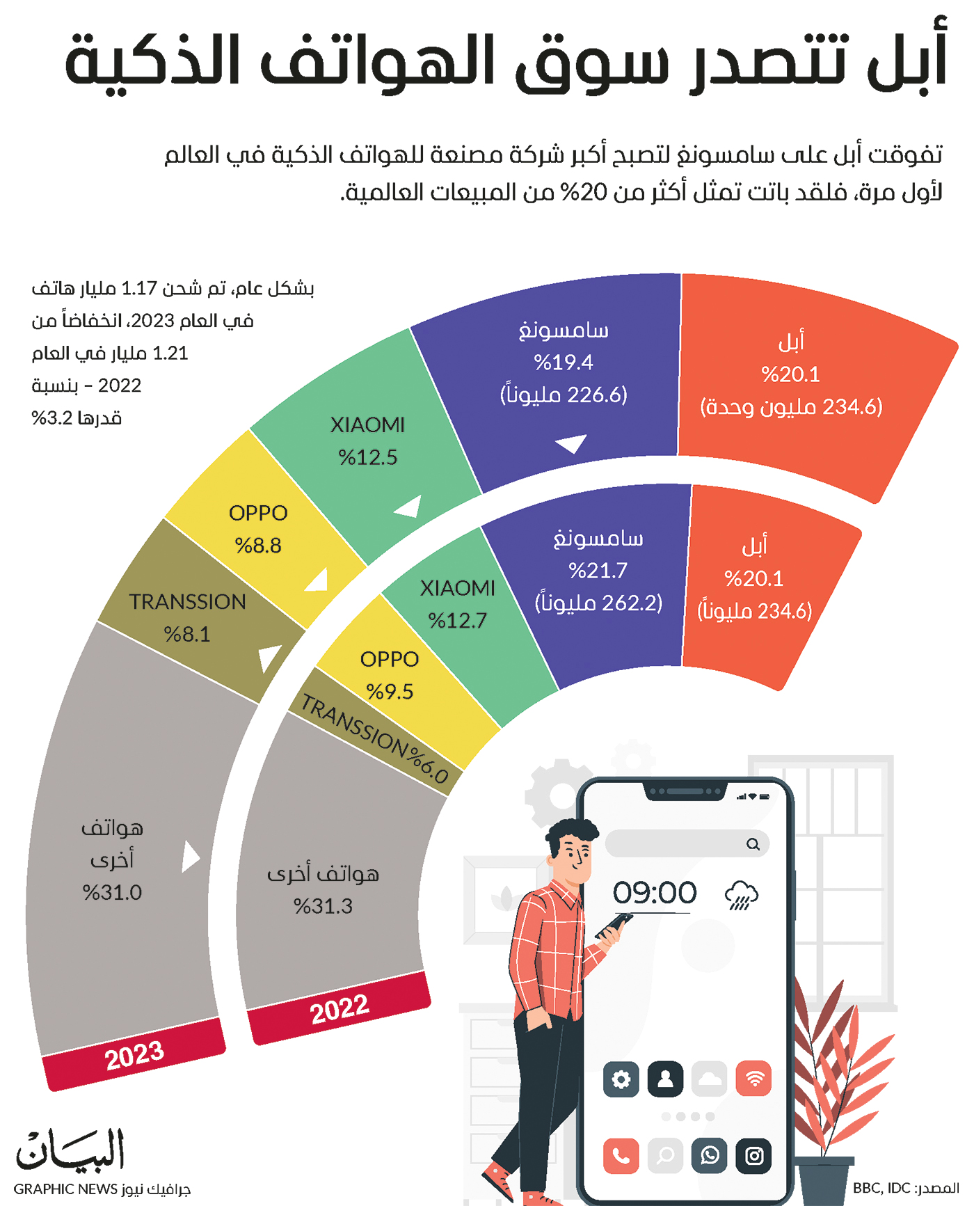أبل تتصدر سوق الهواتف الذكية تفوقت أبل على سامسونغ لتصبح أكبر شركة مصنعة للهواتف الذكية في العالم لأول مرة، فلقد باتت تمثل أكثر من 20 % من المبيعات العالمية.