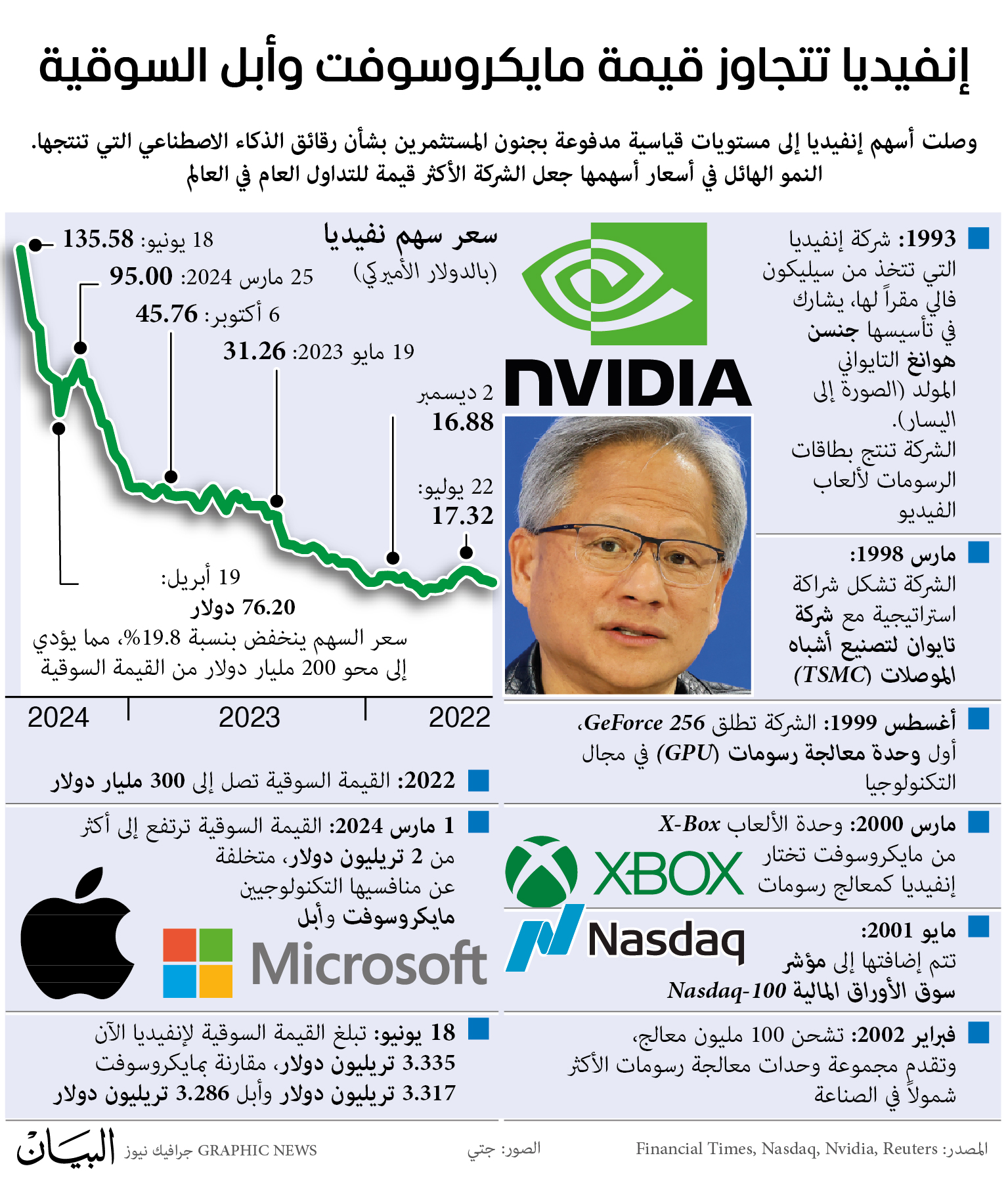 وارتفعت أسهم شركة صناعة الرقائق 3.2 بالمئة إلى 135.21 دولارا، مما رفع قيمتها السوقية إلى 3.326 تريليونات دولار، بعد أيام فقط من تجاوز شركة أبل مصنعة هواتف آيفون لتصبح ثاني أكبر شركة من حيث القيمة.