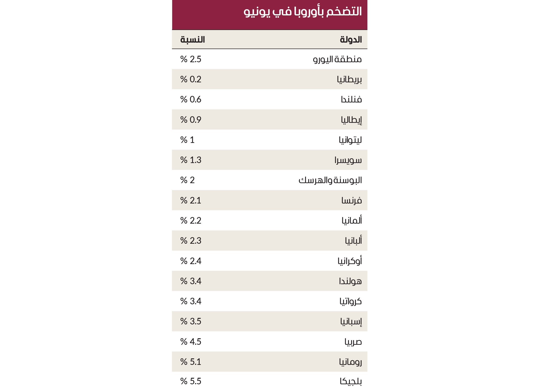وأشارت أحدث تقديرات يوروستات إلى تسجيل معدل تضخم في بلجيكا بواقع 5.5%، وفي إسبانيا 3.5%، مقارنة بـ 3.4% في كل من كرواتيا وهولندا، مع تسجيل المؤشر المنسق لأسعار المستهلك أعلى مستوى، في يونيو. وجاءت أدنى المعدلات في فنلندا، بواقع 0.6%، وفي إيطاليا، و0.9 %، وفي ليتوانيا، 1%.