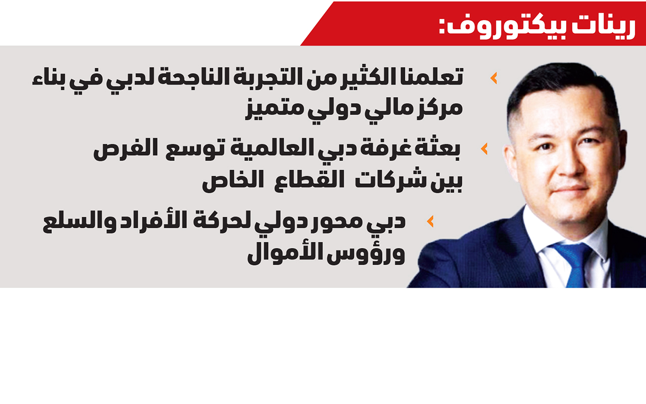 وأشاد بيكتوروف بنجاح دبي في تعزيز مكانتها كمركز عالمي للاستثمار والتجارة، لافتاً إلى أن مجتمع الأعمال في كازاخستان ينظر بإعجاب إلى ما يتم تحقيقه من تطور وتحول كامل ومتجدد في كافة المجالات، وكيف تواصل دبي العمل على ترسيخ دورها كمحور دولي لحركة الأفراد والسلع ورؤوس الأموال، حيث باتت تستقطب الاستثمارات والمستثمرين من كافة أنحاء العالم، وكذلك نخبة المواهب والخبراء في كافة التخصصات.