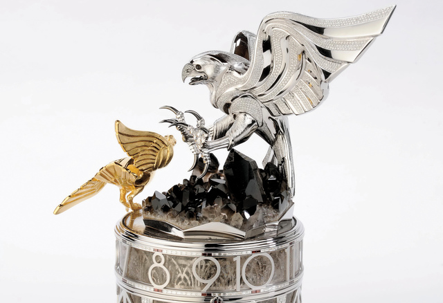 حيث يعكس الصقر هنا تعبيرًا ممتزجًا بالجمال والقوة متأهبًا للانقضاض على فريسته في براعة مهيبة فيما يبدو طائر الحباري مأخوذًا في حميته، ويبسط الصقر، المنحوت من الفضة المصقولة جناحيه، فيبرز كل منهما بترصيع منحدر بأكثر من 6000 ماسة، بما يظهر روعة حركة الطائر في تعقيد ميكانيكي بالغ.