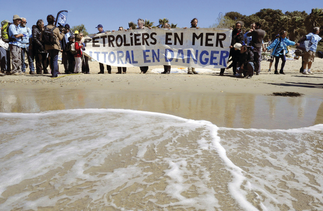 احتجاجات على التنقيب عن نفط المتوسط (ا ف ب)محتجون يرفعون لافتة اعتراض على عمليات التنقيب عن النفط في البحر الأبيض المتوسط على شاطئ كاباسو، الفرنسي بالقرب من «فورت دي بريجانكون». وقال الرئيس الفرنسي نيكولا ساركوزي إنه لن يسمح بالتنقيب عن النفط في البحر المتوسط أمام الخيران.