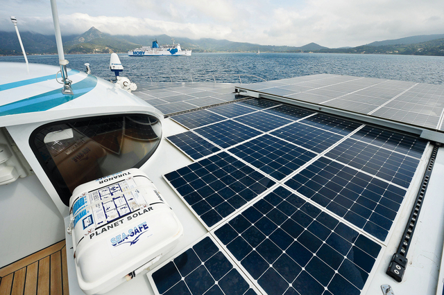 أشخاص ينظرون إلى سفينة تعمل بالطاقة الشمسية لدى مغادرتها ميناء في جزيرة كورسيركا الفرنسية في رحلة تستمر 580 يوما للتنبيه بمخاطر التغير المناخي. ويقول مسيرو السفينة إن هذه الرحلة الطويلة التي تمر بعدد من الموانئ في البحر الأبيض المتوسط ستعمل كثيراً على تعزيز الدعوة للمحافظة على البيئة عبر استخدام وسائل الطاقة البديلة.