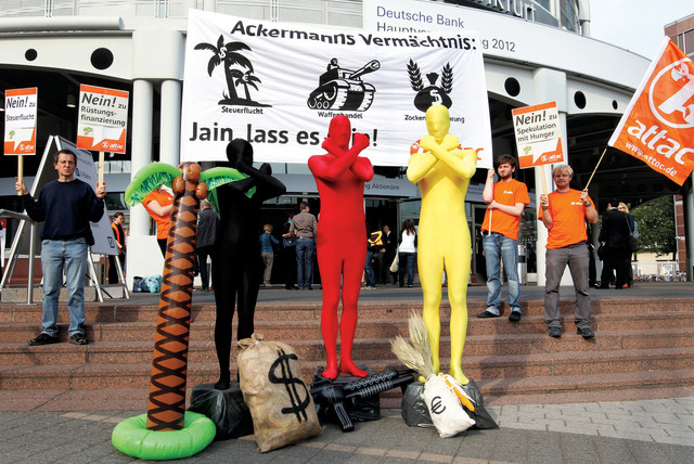 دوتشه بانك يثير غضب المساهمين والناشطين (أ ف بنشطاء من منظمات غير حكومية يتظاهرون خارج مبنى يحتضن الاجتماع السنوي للجمعية العمومية لمساهمي دوتشه بانك الألماني في فرانكفورت احتجاجاً على سياسة المصرف التي يقولون إنها تسببت في مشكلات كبيرة للمساهمين والمودعين على حد سواء.