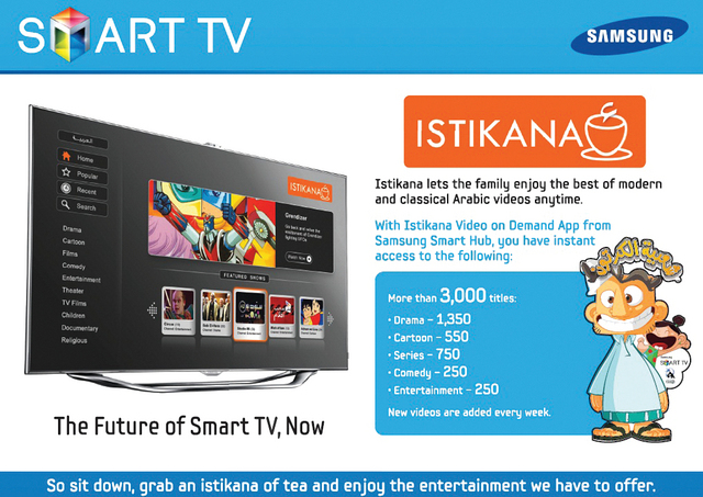 عقدت سامسونغ الخليج للإلكترونيات، الشركة الرائدة في السوق في مجال الإلكترونيات الاستهلاكية، شراكة مع استكانة لإطلاق خدمة مجانية للفيديو عند الطلب VoD في التلفزيونات الذكية. وستوفر استكانة" لمستخدمي التلفزيونات الذكية أكثر من 3,000 ساعة من الأفلام والمسلسلات والمسرحيات العربية، والتي تتضمن الرسوم المتحركة والأفلام والبرامج الوثائقية والمسلسلات التلفزيونية العالمية المدبلجة باللغة العربية.