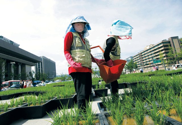 حقول أرز في ساحات كوريا العامة رويترزتنتشر حقول الأرز في ساحات كوريا العامة بهدف تنشيط الزراعة في المدن والساحات الكبرى وسط سيؤول، فيما يتفقد موظفون من الحكومة المحصول الذي سيتم حصاده في الخريف.