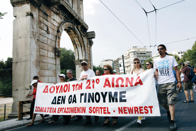 مظاهرات ضد التقشف في اليونان رويترزأضرب الموظفون في قطاع السياحة وقطاعات التموين في اليونان لمدة 24 ساعة أمس وخرجوا بمظاهرة أمام بوابة هادريان القديمة في أثينا احتجاجاً على تدابير التقشف التي تؤثر على صناعتهم، كما رفعوا لافتة تقول "لن نكون عبيداً في القرن الـ 21".