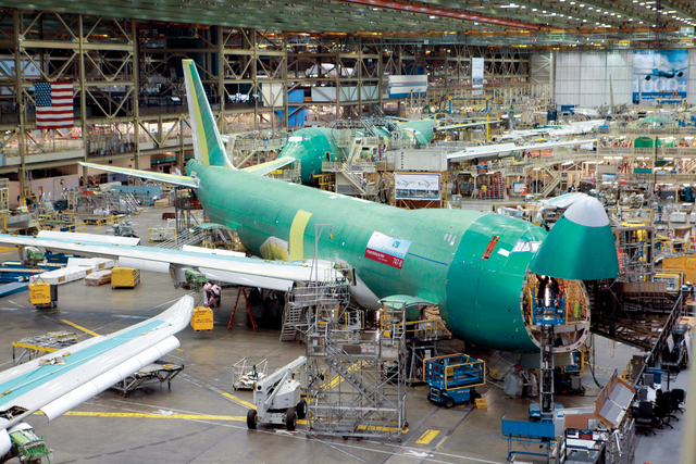 فنيون يقومون بوضع اللمسات الأخيرة على هيكل للطائرة بوينغ 747 -8 في أحد مصانع الشركة بواشنطن حيث تقول الشركة إنها عازمة على الكشف عن منتجات وتقنيات جديدة خلال الفترة المقبلة في ظل المنافسة المحتدمة مع نظيرتها الأوروبية ايرباص. ويأتي هذا في ظل توقعات بأن تشهد حركة الطيران المدني مزيداً من الانتعاش خلال السنوات المقبلة.