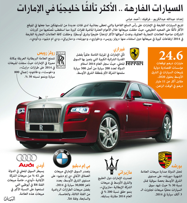 وحققت كافة العلامات التجارية الفارهة في 2014 ارتفاعات كبيرة في مبيعاتها دون استثناء، منها «رولز رويس»، و«فيراري»، و«بورشه»، و«مازيراتي»، و«بي ام دبليو»، و«أودي».