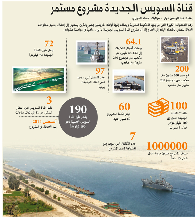 رغم التحديات الكبيرة التي تواجهها الحكومة المصرية ويضاف إليها أولئك المتربصين بمصر والذين يسعون إلى إفشال جميع محاولات الدولة للمضي باقتصاد البلاد إلى الأمام إلا أن مشروع قناة السويس الجديدة لا يزال ماضياً في مواصلة مشواره.