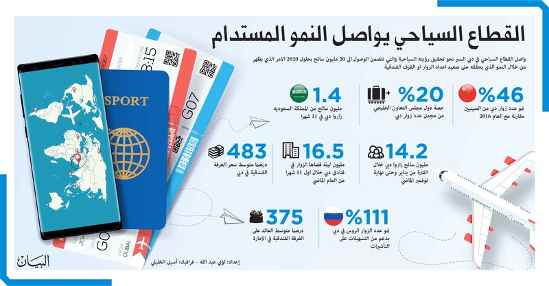 واصل القطاع السياحي في دبي السير نحو تحقيق رؤيته السياحية والتي تتضمن الوصول الى 20 مليون سائح بحلول 2020 الامر الذي يظهر من خلال النمو الذي يحققه على صعيد اعداد الزوار او الغرف الفندقية.