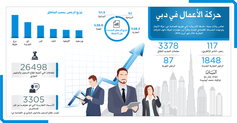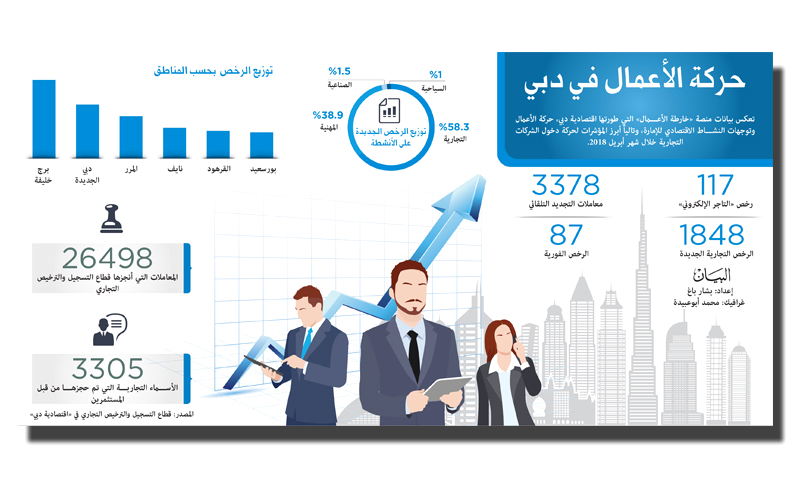 تعكس بيانات منصة «خارطة الأعمال» التي طورتها اقتصادية دبي، حركة الأعمال وتوجهات النشاط الاقتصادي للإمارة، وتالياً أبرز المؤشرات لحركة دخول الشركات التجارية خلال شهر أبريل 2018.