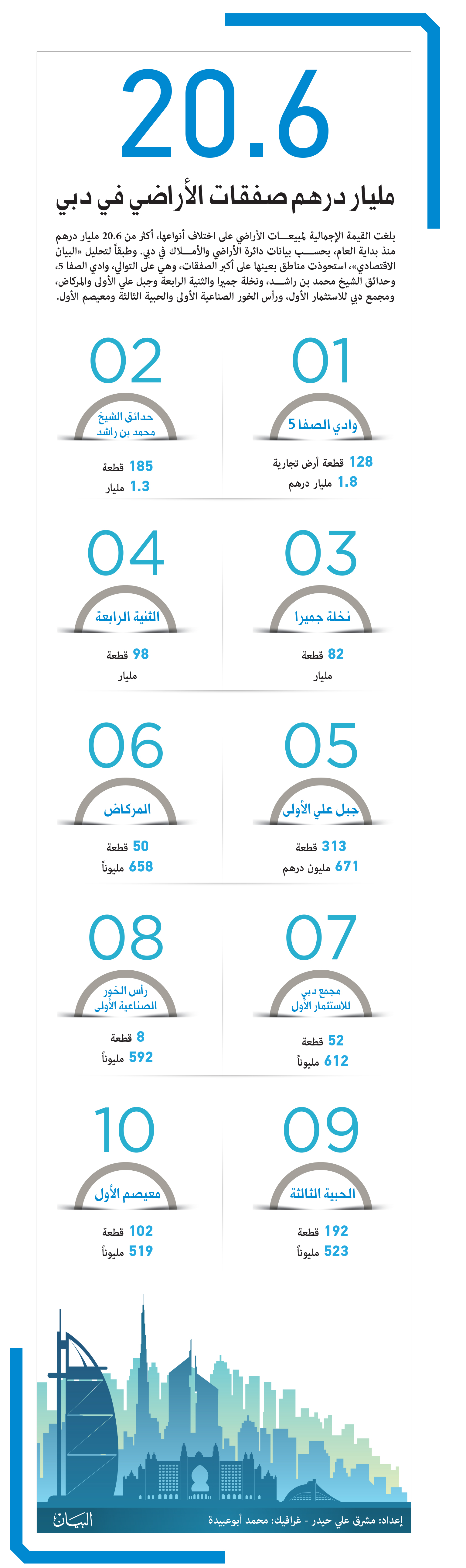 بلغت القيمة الإجمالية لمبيعات الأراضي على اختلاف أنواعها، أكثر من 20.6 مليار درهم منذ بداية العام الجاري، بحسب بيانات دائرة الأراضي والأملاك في دبي.