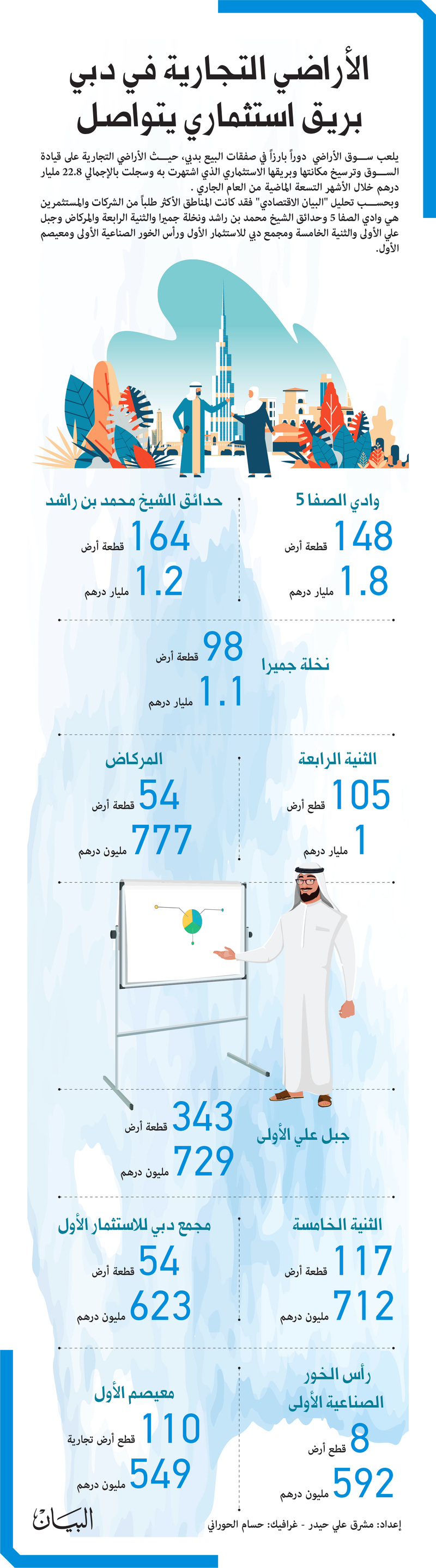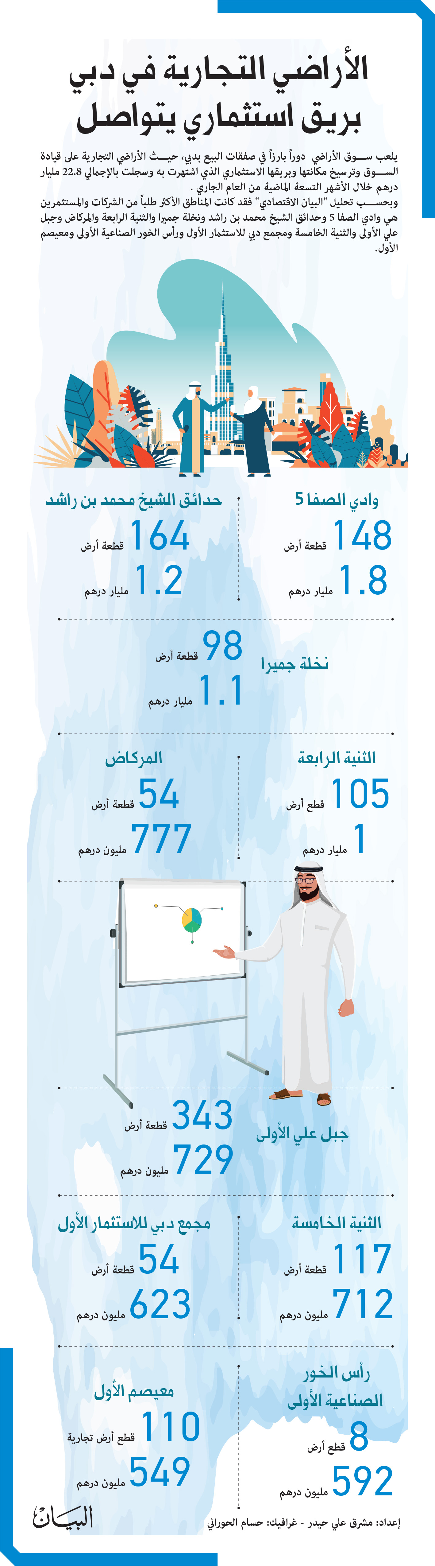 يلعب سوق الأراضي دوراً بارزاً في صفقات البيع بدبي، وقد حافظت الأراضي التجارية على قيادة السوق وترسيخ مكانتها وبريقها الاستثماري الذي اشتهرت به وسجلت بالإجمالي 22.8 مليار درهم خلال الأشهر التسعة الماضية من العام الجاري .