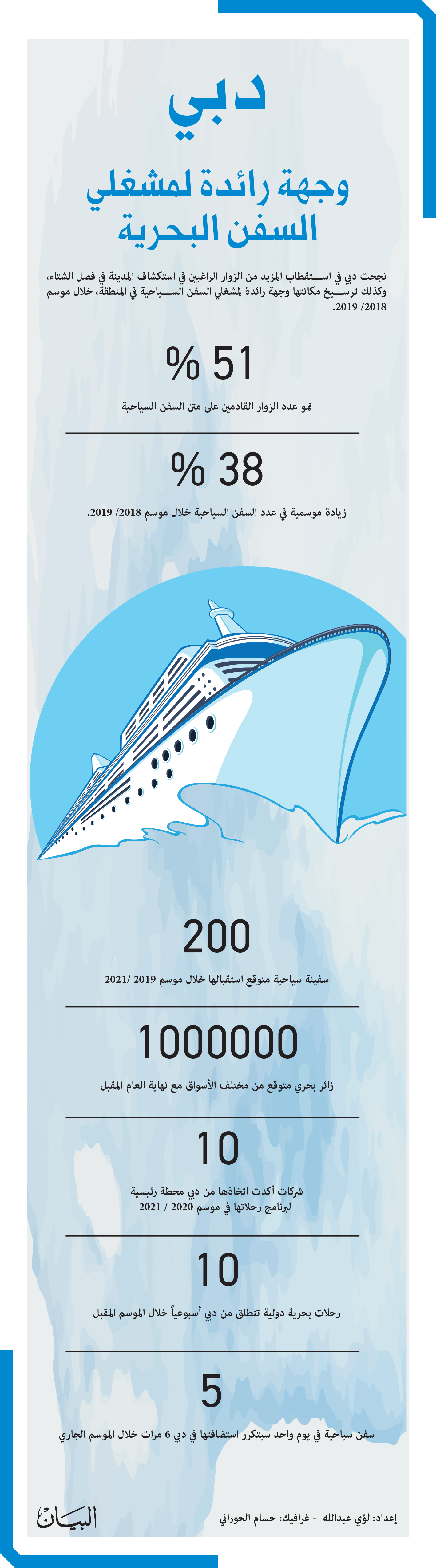 نجحت دبي في استقطاب المزيد من الزوار الراغبين في استكشاف المدينة في فصل الشتاء، وكذلك ترسيخ مكانتها وجهة رائدة لمشغلي السفن السياحية في المنطقة، خلال موسم 2018/ 2019.