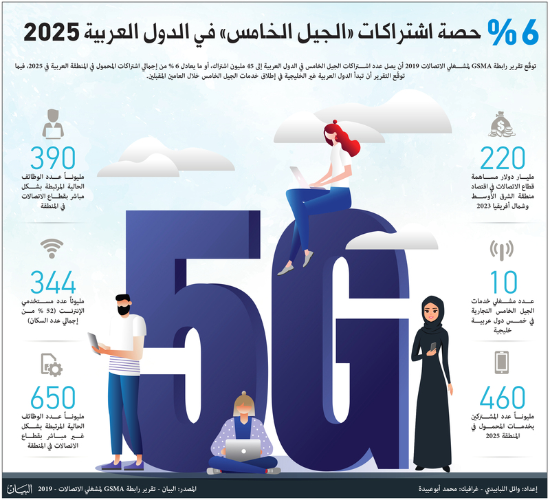 توقّع تقرير رابطة GSMA لمشغلي الاتصالات 2019 أن يصل عدد اشتراكات الجيل الخامس في الدول العربية إلى 45 مليون اشتراك، أو ما يعادل 6% من إجمالي اشتراكات المحمول في المنطقة العربية في 2025، فيما توقّع التقرير أن تبدأ الدول العربية غير الخليجية في إطلاق خدمات الجيل الخامس خلال العامين المقبلين.