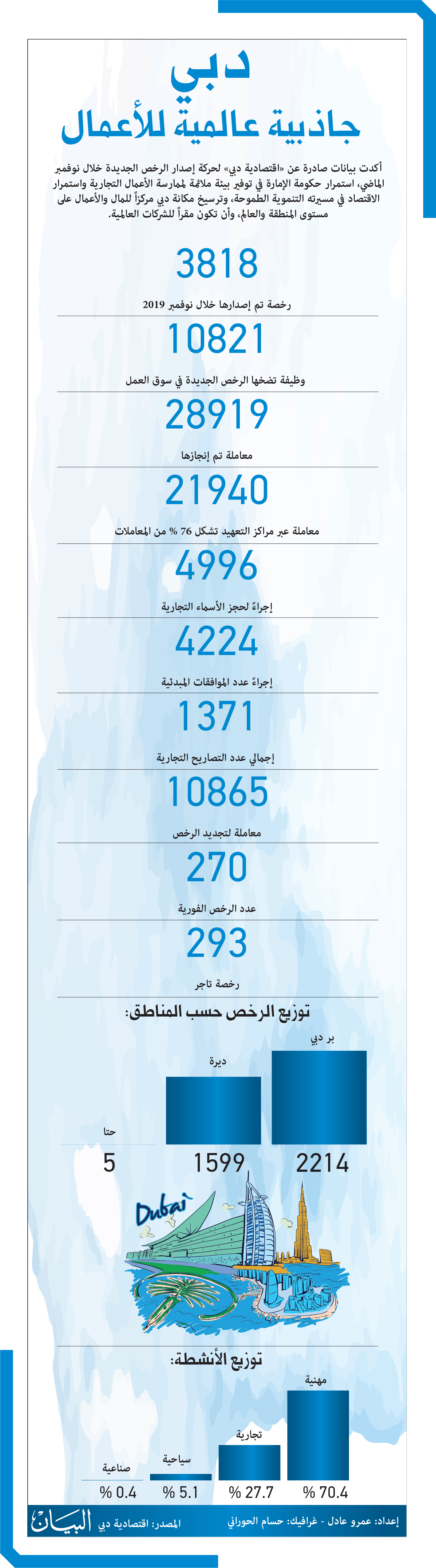 أكدت بيانات صادرة عن «اقتصادية دبي» لحركة إصدار الرخص الجديدة خلال نوفمبر الماضي، استمرار حكومة الإمارة في توفير بيئة ملائمة لممارسة الأعمال التجارية واستمرار الاقتصاد في مسيرته التنموية الطموحة، وترسيخ مكانة دبي مركزاً للمال والأعمال على مستوى المنطقة والعالم، وأن تكون مقراً للشركات العالمية.