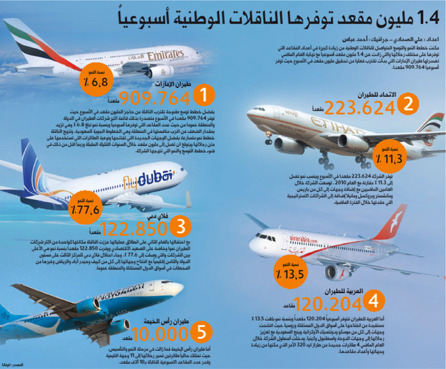 مكنت خطط النمو والتوسع المتواصل للناقلات الوطنية من زيادة كبيرة في اعداد المقاعد التي توفرها على مختلف رحلاتها والتي زادت عن 1.4 مليون مقعد اسبوعيا مع نهاية العام الماضي تصدرتها طيران الامارات التي بدأت تقترب فعليا من تحقيق مليون مقعد في الاسبوع حيث توفر اسبوعيا 909.764 مقعدا.