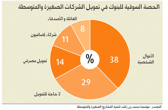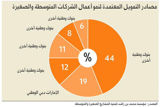 كشف مؤشر تمويل المؤسسات الصغيرة والمتوسطة الذي أطلقته أمس، مؤسسة محمد بن راشد لتنمية المشاريع الصغيرة والمتوسطة، إحدى مؤسسات دائرة التنمية الاقتصادية في دبي، أن 14 % فقط من الشركات المتوسطة والصغيرة في الدولة والتي شملتها دراسة المؤشر تعتمد على التمويل المصرفي لتنمية عملياتها، وقدر أن هذا القطاع يتيح فرصا لتحقيق عوائد تمويلية للمصارف تصل قيمتها إلى 6 مليارات درهم لم يتم الاستفادة منها بعد ، وأوضح المؤشر أن 38 % من أصحاب المشاريع يعتمدون على أموالهم الشخصية لتمويل توسعاتهم، فيما أجاب 29 % من المشمولين في الدراسة أنهم ليسوا بحاجة إلى تمويل إضافي، وأظهر المؤشر أن 11 % من الشركات حصلت على تمويل من خلال شركاء إضافيين و8 % حظت بمساعدة الأهل والأصدقاء.