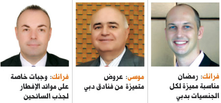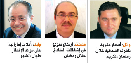 من جهته، قال وليد العوا، المدير العام لفندق تماني دبي مارينا، إن شهر رمضان المبارك يعد فرصة جيدة للفنادق لتنويع الدخل، إذ لا تعتمد غالبية الفنادق بدبي خلال رمضان على معدلات الإشغال، لكن جزءا كبيرا من المدخول يأتي عن طريق تقديم الأكلات الرمضانية خلال وجبات الإفطار، بالإضافة إلى سهرات السحور.