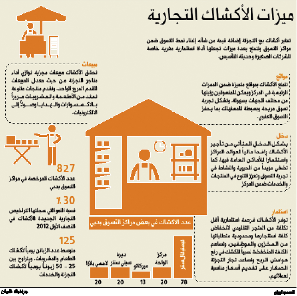 يبلغ عدد الأكشاك المرخصة في مراكز التسوق بدبي ما لا يقل عن 827 كشكاً، وفقاً لمحمد شاعل السعدي المدير التنفيذي للتسجيل والترخيص التجاري في دائرة التنمية الاقتصادية بدبي، والذي أكد نمو الطلب على هذا النوع من المنافذ التجارية من قبل المستثمرين، حيث تم إصدار 305 رخص للأكشاك خلال النصف الأول من العام الجاري، مقارنة مع 229 تصريحاً خلال نفس الفترة من العام الماضي، أي بنمو لا يقل عن 30 %.