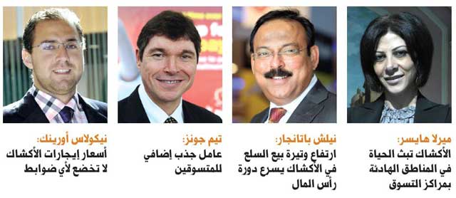 من جانبه، أكد ديفيد ماك آدم رئيس قسم التجزئة لمنطقة الشرق الأوسط وشمال إفريقيا في شركة جونز لانغ لاسال، أن الأكشاك تلعب دوراً هاماً في تنويع العروض التجارية في مراكز التسوق، إضافة إلى ما تمثله من تجربة اختبارية لمفاهيم تجارة التجزئة الجديدة، ولفت إلى أن بعض المتسوقين يستمتعون بالتسوق في الأكشاك نتيجة لطبيعة منتجاتها البسيطة، والأسعار الأفضل التي يمكنهم الحصول عليها.