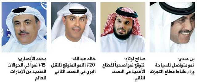 قال خالد عبدالله رئيس مجموعة النقل البري: قطاع النقل البري مهم للغاية ويلعب دوراً كبيراً ومحورياً في اقتصاد دبي. وقد حقق قطاع النقل البري في دبي نموا بنسبة 15 % خلال النصف الاول من العام الحالي ونتوقع نموه بنحو 20 % في النصف الثاني من العام بسبب تخفيض اسعار شحن البواخر من الصين وأوروبا.