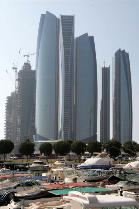 حيث يصل ارتفاعه إلى 382 متراً بعدد طوابق 88 طابقاً، كما تنتشر على طول كورنيش أبوظبي أبراج ناطحات السحاب مثل برج لاند مارك بجوار برج جهاز أبوظبي للاستثمار بارتفاع يصل إلى 330 متراً وأبراج الاتحاد بارتفاع 305 أمتار و80 طابقاً وأبراج فندق سوفتيل الثلاثة.