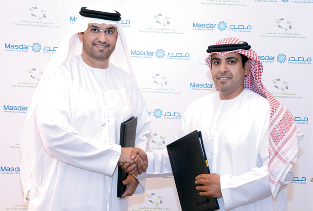 وقع مركز إدارة النفايات - أبوظبي امس مذكرة تفاهم شاملة مع شركة أبوظبي لطاقة المستقبل «مصدر»، حول مبادرة أبوظبي لتطوير حلول الطاقة المتجددة. وقع الاتفاقية كل من محمد راشد الهاملي، مدير عام مركز إدارة النفايات أبوظبي، والدكتور سلطان أحمد الجابر، الرئيس التنفيذي لشركة «مصدر».