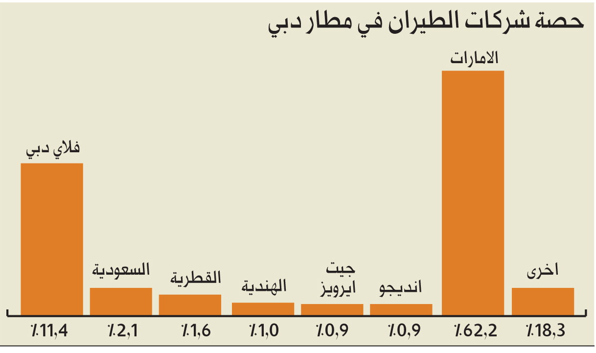 ووفقا لتقرير مركز اسيا الهادئ للطيران فإن فلاي دبي باتت ثاني أكبر ناقلة في مطار دبي بحصة تصل إلى 11.4 % بعد طيران الامارات التي تشكل 62.2 % من الحركة الجوية في مطار دبي.
