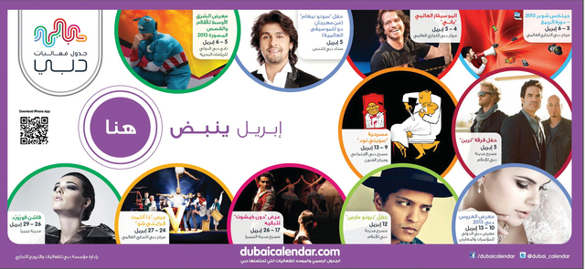 وحسب الجدول، ستأخذ دبي طابعاً مختلفاً خلال شهر أبريل المقبل تبرز فيه الأجواء الاحتفالية والحفلات الموسيقية والغنائية لنجوم عالميين مثل عمر دياب وحسين الجسمي وياني وبرونو مارس، بالإضافة إلى العديد من الفعاليات الأخرى التي تعنى بالمجال التعليمي والثقافي وتكنولوجيا المعلومات والسينما والأزياء وغيرها.