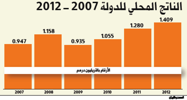 نما الناتج المحلى الإجمالي للدولة 4.4% إلى 1.4 تريليون درهم في 2012. وقال تقرير صادر عن المركز الوطني للإحصاء إن السنوات من 2001 -2012 شهدت تحسنا مستمرا في مستوى هذا المؤشر الاقتصادي المهم، ولاسيما مع نهاية 2012.