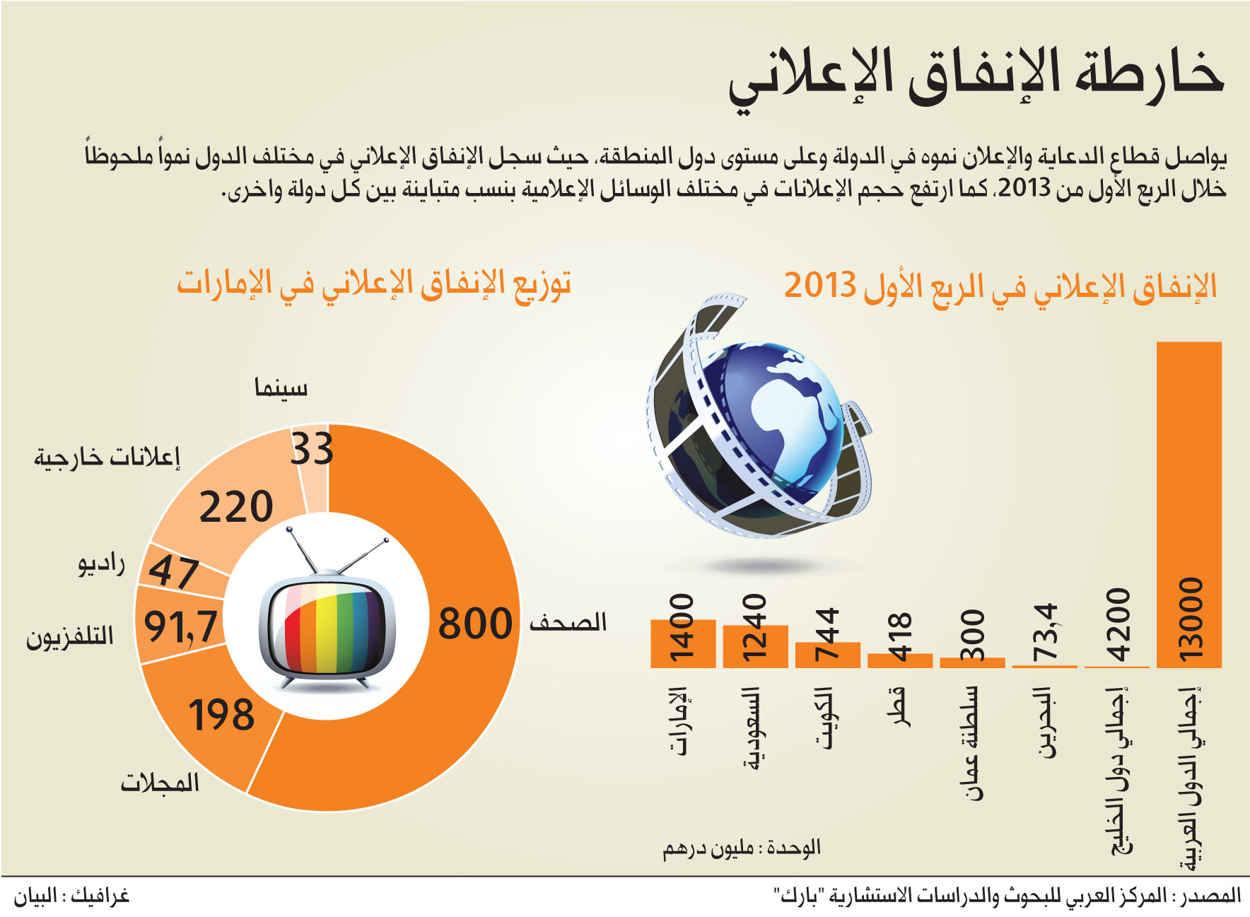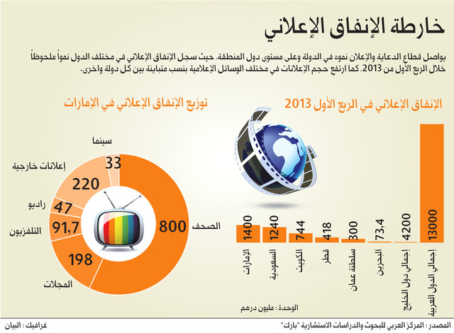 وبلغ حجم الإنفاق الإعلاني العربي خلال الربع الأول من العام الجاري 13 مليار درهم مقارنة مع 11.7 مليار درهم خلال نفس الفترة من العام الماضي، بنمو وقدره 11 % .