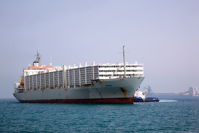 وصلت السفينة يوم السبت تحمل 650 رأساً من الأبقار ونحو 20,000 رأس من الأغنام التي جاءت من استراليا محمّلة على سطح باخرةٍ صممت خصيصاً لتوفر التهوية الطبيعية طوال خط سير الرحلة. يقول عبد الكريم المصعبي، نائب الرئيس بميناء خليفة إن الشحنات الواردة إلى ميناء خليفة من الماشية تشكل واحداً من مجالات الأعمال المتعددة التي سنعمل على إضافتها لعمليات الميناء.